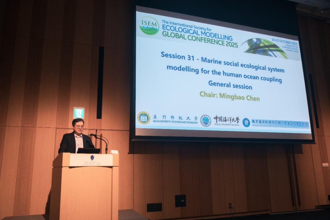 研究團隊牽頭人澳科大可持續發展研究所助理教授陳明寶受邀主持 Session 31「人-海耦合視角下的海洋社會-生態系統建模」(Marine Social-Ecological System Modelling for the Human-Ocean Coupling)分會場,並發表開場主旨發言。該分會場以 「人-海耦合系統建模」 為核心議題,旨在通過複雜系統科學方法,深化對社會行為、生態過程與治理反饋之間非線性作用機制的科學認知。